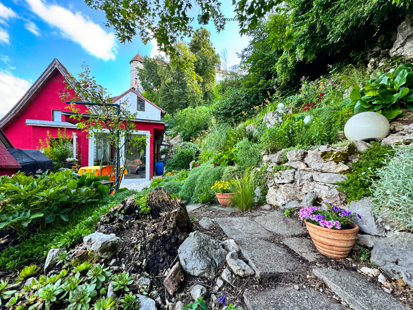 Das wunderschöne "Aquarium" (Wintergarten) bietet einen traumhaften Blick auf den Garten und das Schloss Hellenstein. Die gemütliche, nicht einsehbare Terrasse lädt zum Entspannen ein.