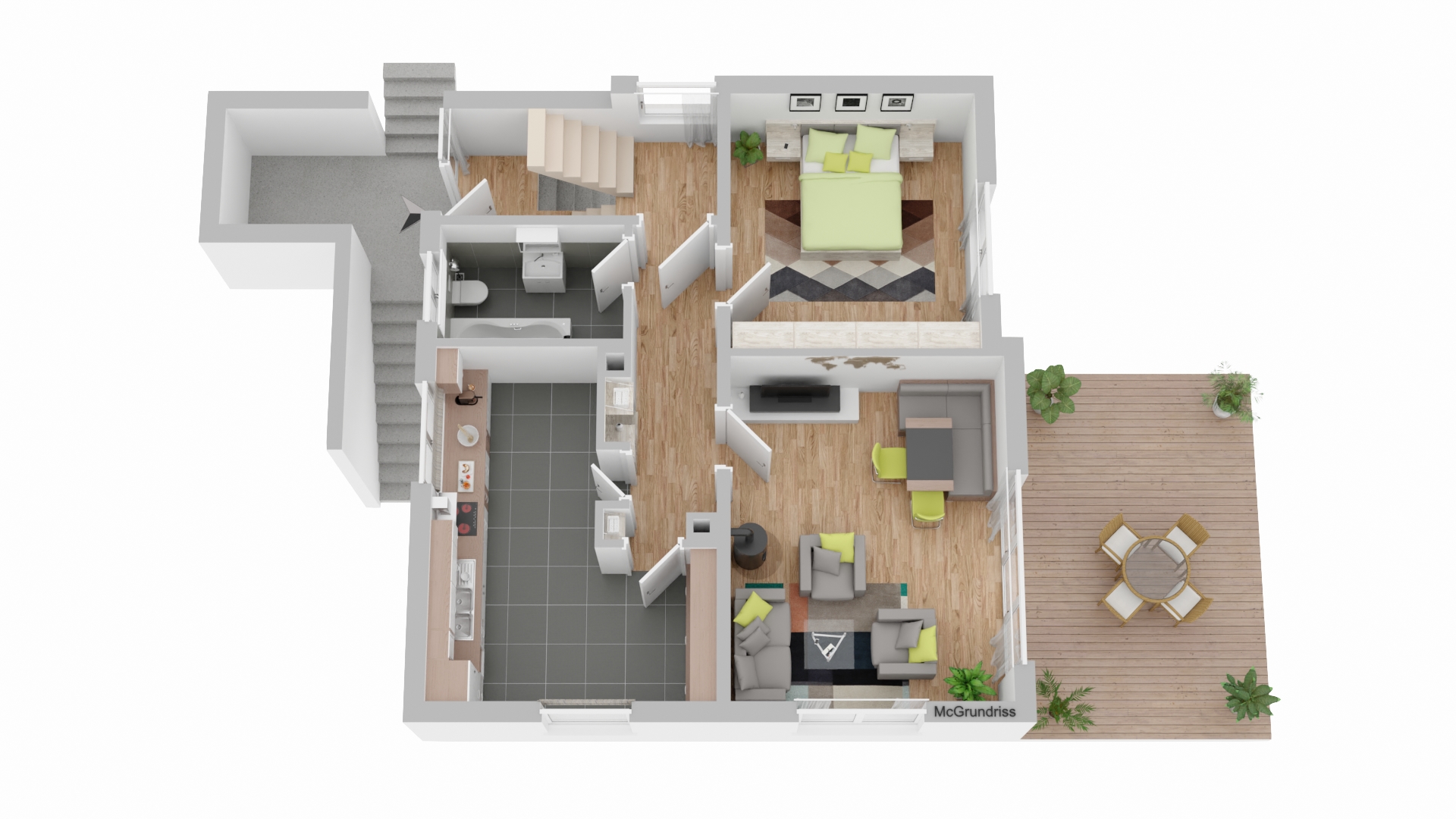 Im Erdgeschoss erwartet Sie eine geräumige Küche mit Platz für einen Essbereich, ein helles Wohnzimmer mit direktem Zugang zur großen Terrasse, ein Schlafzimmer sowie ein Badezimmer.