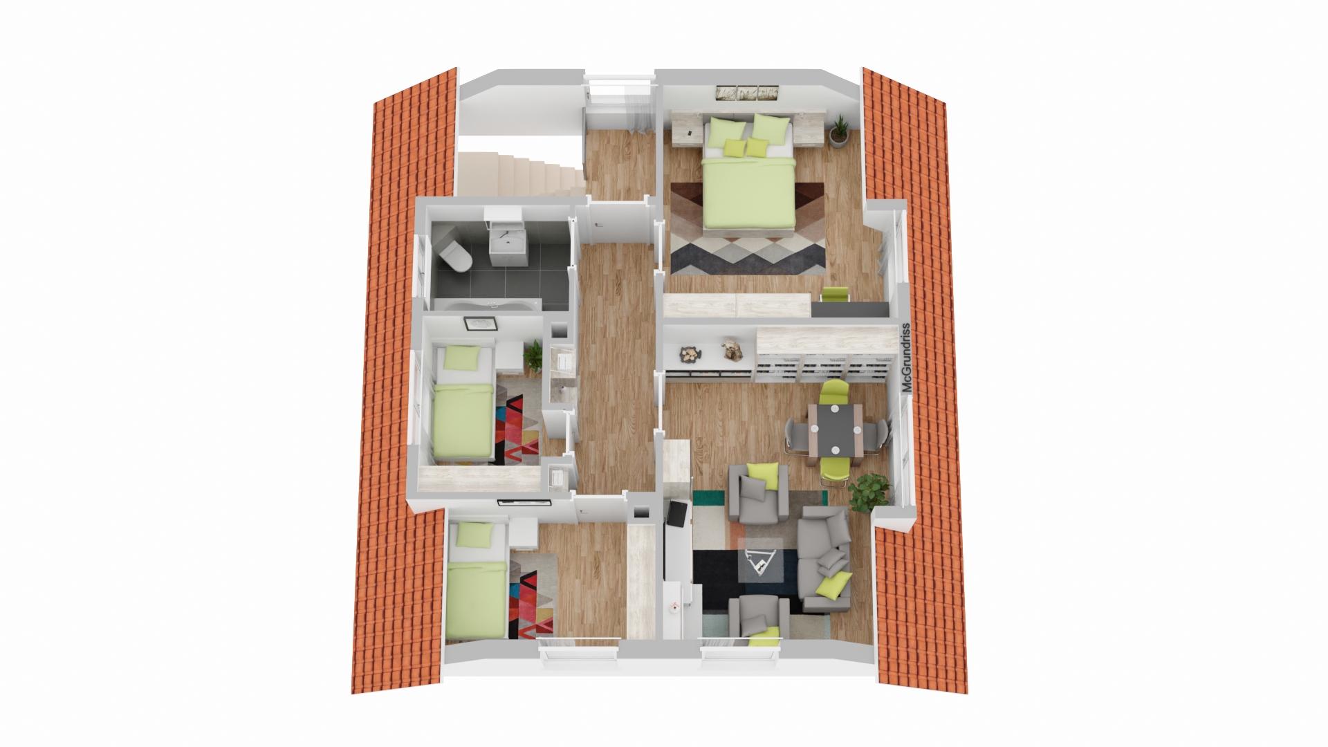 Das Dachgeschoss verfügt über drei gut geschnittene Schlafzimmer, ein Büro sowie ein weiteres Badezimmer. Die durchdachte Raumaufteilung bietet vielfältige Nutzungsmöglichkeiten – ideal für Familien, Homeoffice oder Gästezimmer.