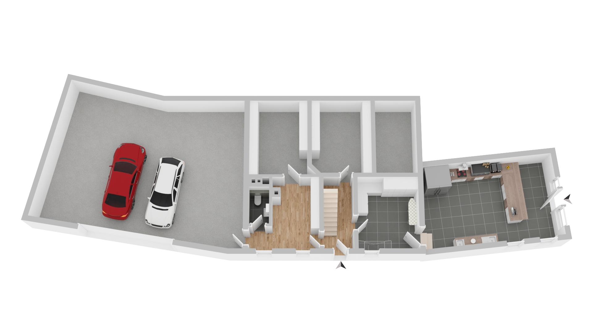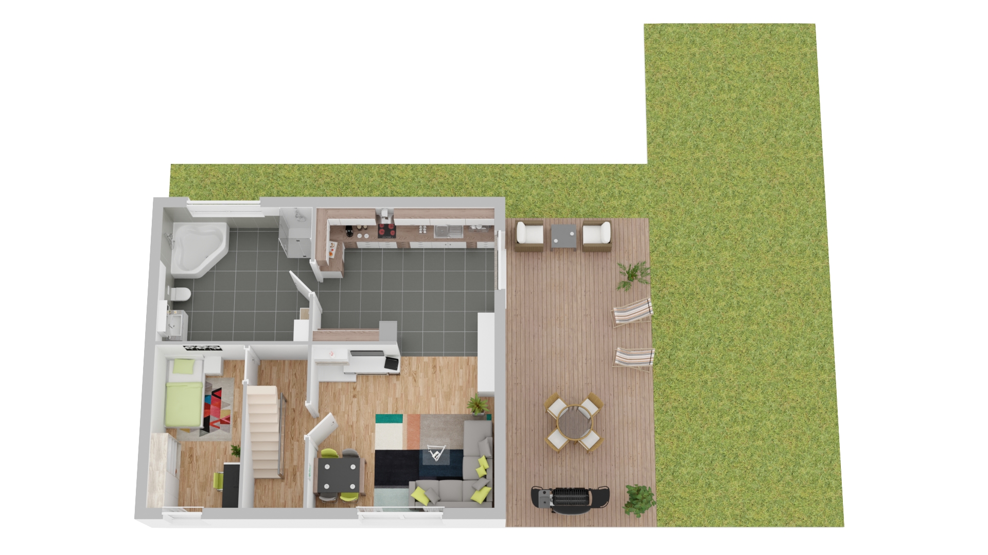 Der eigentliche Wohnbereich beginnt im Obergeschoss. Hier befindet sich ein offen gestalteter Wohn-, Ess- und Küchenbereich mit direktem Zugang zur großen Terrasse sowie zum Garten, der sich ideal für entspannte Stunden im Freien eignet.